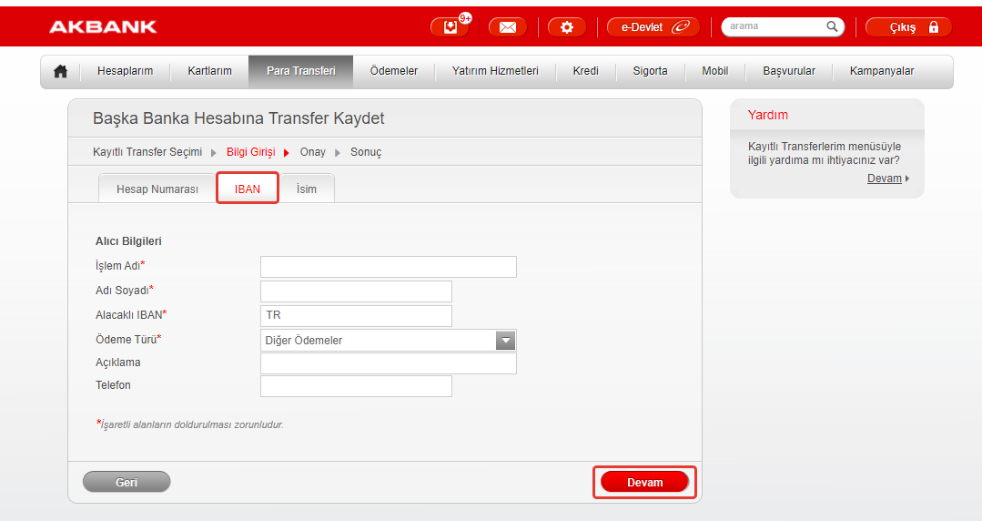 3- IBAN sekmesini seçip buraya EFT yapmak istediğimiz kişiye ait bilgileri girip “Devam” diyelim.