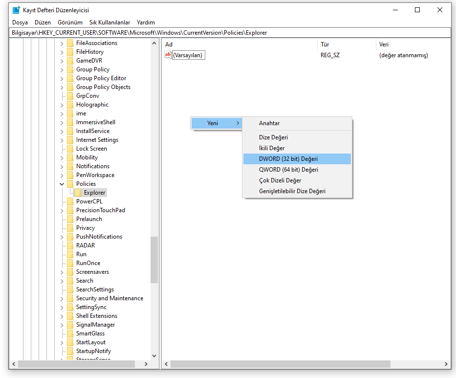 Bilgisayar | HKEY_CURRENT_USER | SOFTWARE | Microsoft | Windows | CurrentVersion | Policies | Explorer sekmesine kadar gidelim.